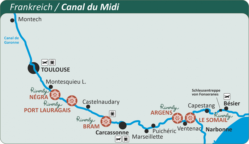 Ab Argens oder Le Somail entdecken Sie mittelalterliche Orte wie Trèbes und Puichéric, die römische Stadt Narbonne und schließlich Béziers mit den berühmten neun Schleusen von Fonseranes – ein Meisterwerk der Wasserbaukunst und krönender Abschluss Ihrer Hausbootreise.