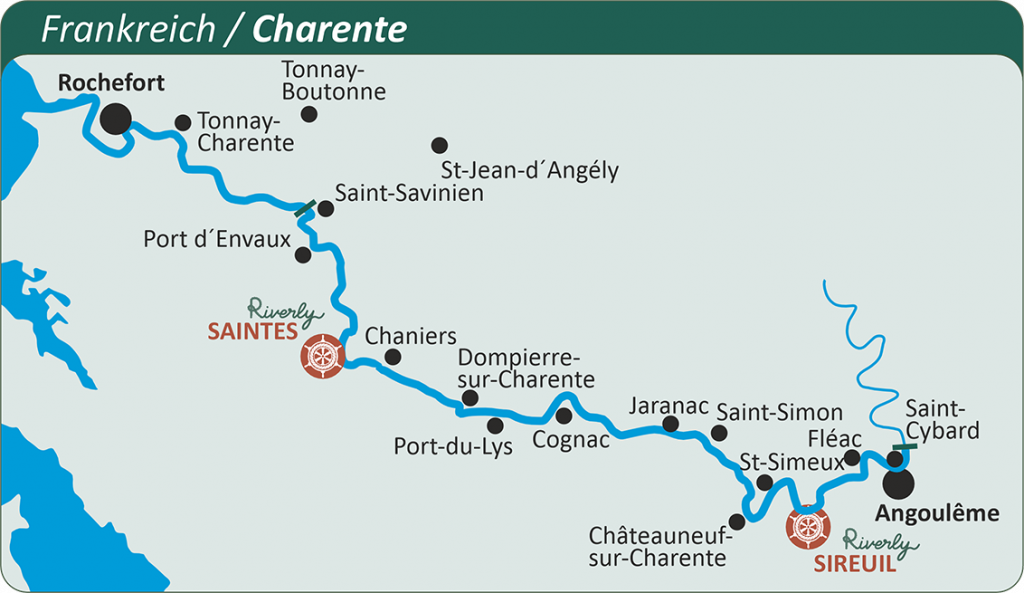 Ab Saintes erwarten Sie geschichtsträchtige Orte wie Saint-Savinien, Chaniers und Bourg-Charente, während in Saint-Simon das Erbe der traditionellen Flussschiffer lebendig wird. Weiter flussaufwärts lockt Cognac mit seinen berühmten Destillerien und das historische Récollets-Kloster.
