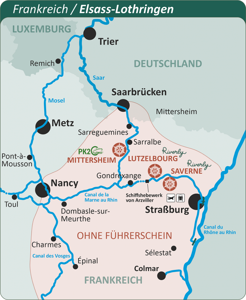 Für eine Hausbootfahrt in der auf der Karte rosa markierten Zone – zwischen Saarbrücken, Nancy und Colmar – ist kein Bootsführerschein erforderlich. Außerhalb dieses Bereichs benötigen Sie einen gültigen Bootsführerschein Ihres Wohnsitzlandes. Wird in Ihrem Land kein entsprechender Schein ausgestellt, kann auch keiner verlangt werden.