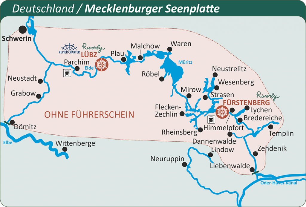 Ab Lübz führt Ihre Hausbootreise durch Mecklenburg über weite Seenlandschaften, stille Wasserwege und historische Städte. Richtung Osten erreichen Sie die Müritz und den Plauer See – glasklare Gewässer, umgeben von alten Häfen und lebendiger Natur. Auf der Stör-Elde-Wasserstraße lockt Schwerin mit seinem märchenhaften Schloss auf einer Insel.
